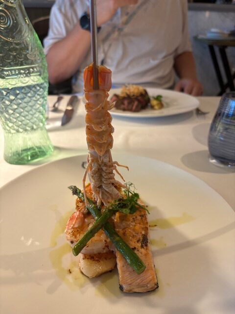 The first night we had dined in Sabatini’s which we had loved on a previous Cruise, but it wasn’t like we remembered it – what do they say never go back!! Anyway despite Dave being allergic to some fish and not liking many others we tried The Catch and what a catch it turned out to be. We were brought Sparkling Wine and offered different berries to put in it. We were offered water with added Lemon and/or Lime. The Amuse Bouche was so big it was almost like a main course. I took the opportunity to try out different fish dishes, as I don’t often cook fish for myself at home.